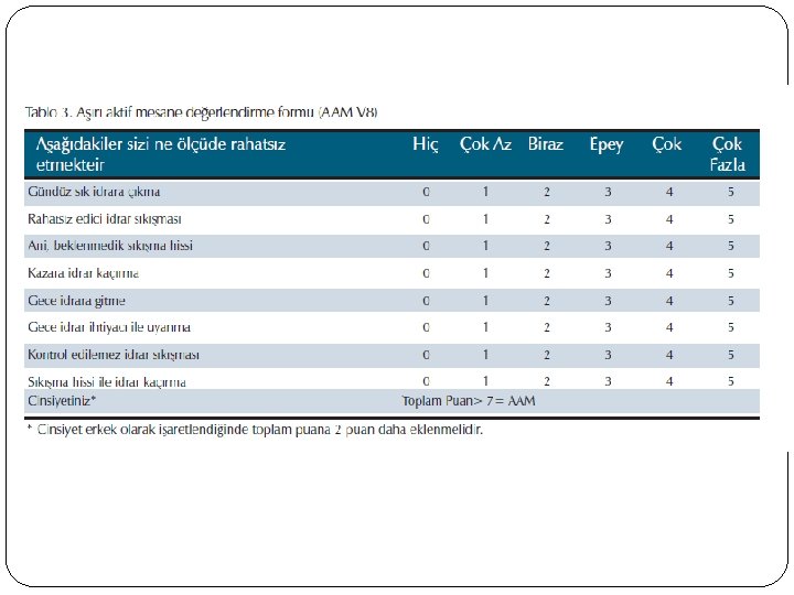 Aşırı Aktif Mesane tanısı… Ayrıntılı anamnez (yalnızca şikayetlerle tanı) Laboratuvar incelemeler, testler : ayırıcı tanıda başka bir patoloji olmadığını göstermek için… İdrar tahlili, Glukoz (DM? ), üriner sistem USG ( tm, kist, kitle), sistoskopi (hematüri ve tm şüphesinde) AAM semptomları gibi DAVRANAN hastalıklar: Diyabet, Felç, Spinal kord yaralanması, bel fıtığı operasyon öyküsü, vs, Tanıda ürodinami şart DEĞİL!