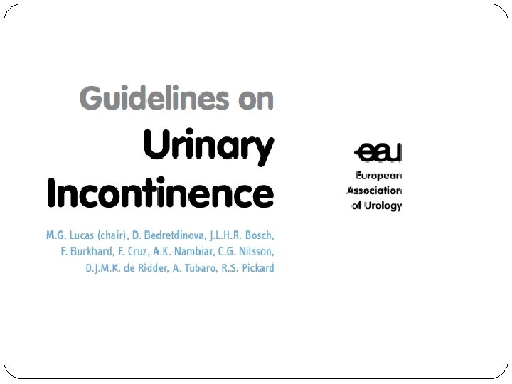 Fizik muayene / Lab inceleme Tüm fizik, pelvik, jinekolojik be nörolojik muayene Stres testi İdrar analizi ( hematüri, proteinüri. . ) Kreat. ? Fantl JA et al. Managing Acute and Chronic Urinary Incontinence. Clinical Practice Guideline. Quick Reference Guide for Clinicians, No. 2, 1996 Update. Rockville, MD: Agency for Health Care Policy and Research; January 1996. AHCPR publication 96 -0686.