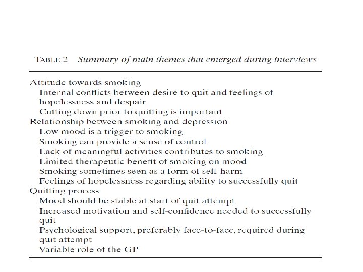 • Kalitatif araştırmalar, mental hastalığı olan sigara içenlerin sigarayı bırakmaya destek olan kişilerle anlamlı bir ilişkiye sahip olmaları gerektiğini ortaya koymuştur. (6) • Genel pratisyenlik bunu sunabilir. • Depresyon ve sigara içme ilgili önceki çalışmalar ayakta tedavi veren mental sağlık merkezlerine dayanmaktadır (7) ve genel pratisyenlik ortamında depresif sigara içenlerin deneyimleri hakkında çok az şey bilinmektedir.