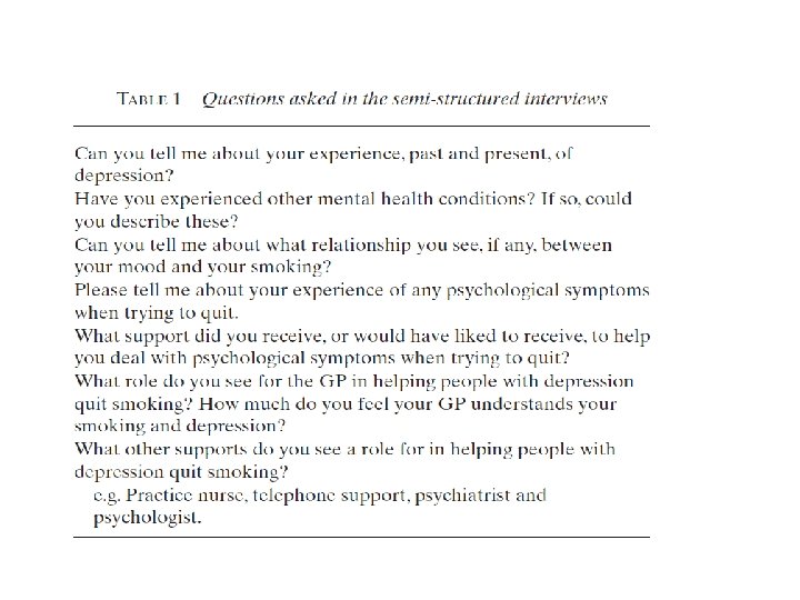 METOD Yöntem • Telefonla yarı yapılandırılmış derinlemesine görüşmeler yapıldı. • Katılımcılardan, depresyon ve diğer mental sağlık durumlarıyla ilgili yaşadıkları deneyimleri; sigara ve mental sağlık arasında algıladıkları ilişkiyi; önceki bırakma girişimleri ile ilgili deneyimlerini ve birinci basamakta hangi yardımların sigarayı bırakma konusunda yararlı olabileceğini anlatmaları istendi. (tablo 1)
