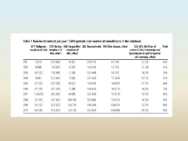 • Bu çalışmanın amacı 2001 -2010 yılları arasında genel pratikte malignite şüphesi olan cilt lezyonları nedeniyle tedavi talebini belirlemektir. • Başvuru oranları ve pratisyen hekimlerin uyguladıkları tedaviler, yakın izlem, lezyonun eksizyonu ve ikinci basamağa sevk durumları özellikle değerlendirildi.