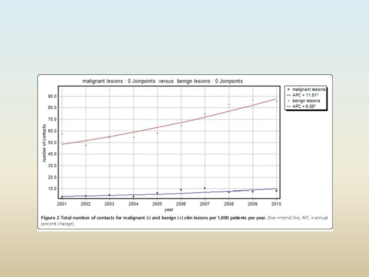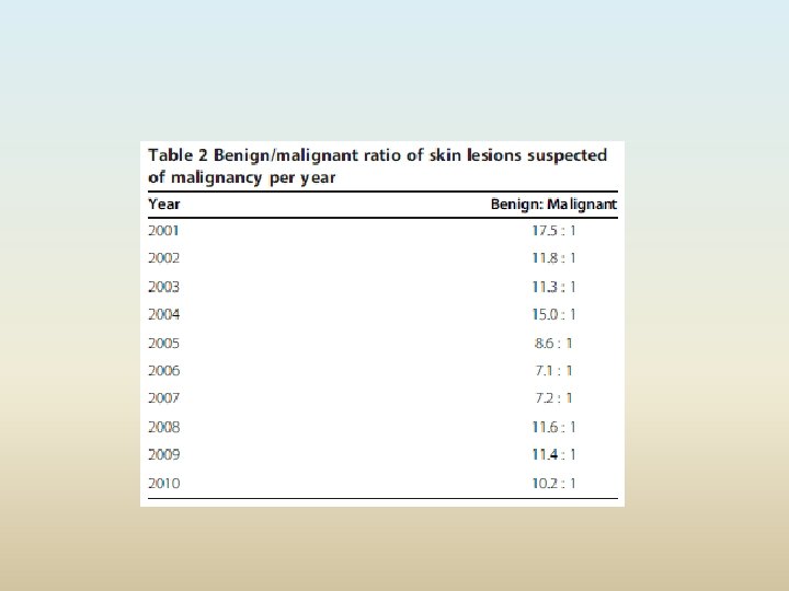 • Yıllık artış hem malign (%11. 8) hem de malign olmayan (%6. 9) lezyonlarda görülmüştür. • 2010 yılında malignite şüphesi bulunan 10 deri lezyonundan sadece 1'i maligndi.