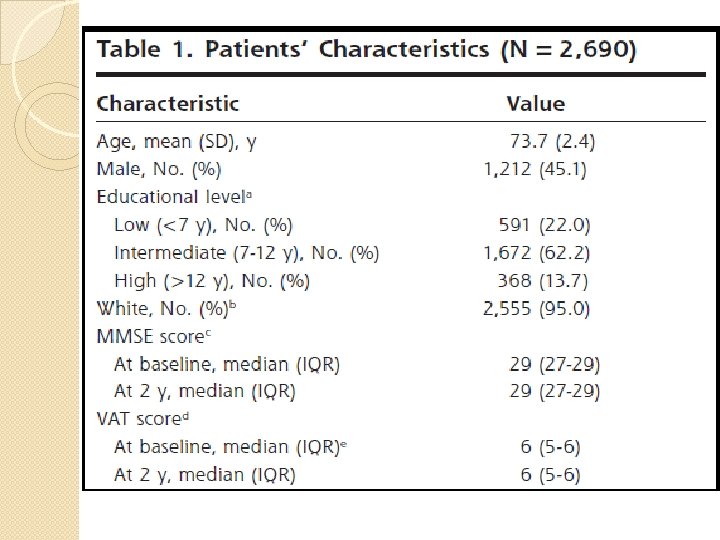 Bulgular � Demans tanısı olmayan 3526 pre. DIVA çalışması hastasının 2690'ı (% 76. 3) başlangıç ve 2 yıllık takip değerlendirmelerini tamamlamış ve analizlerimize dahil edilmiştir. � Sosyodemografik ve bilişsel özellikler Tablo 1'de özetlenmiştir. � İki yıllık takip ziyaretinden önce veya kısa bir süre sonra demans tanısı alan 14 hastayı dışladık.