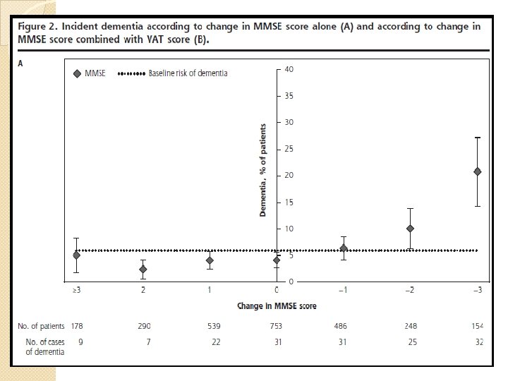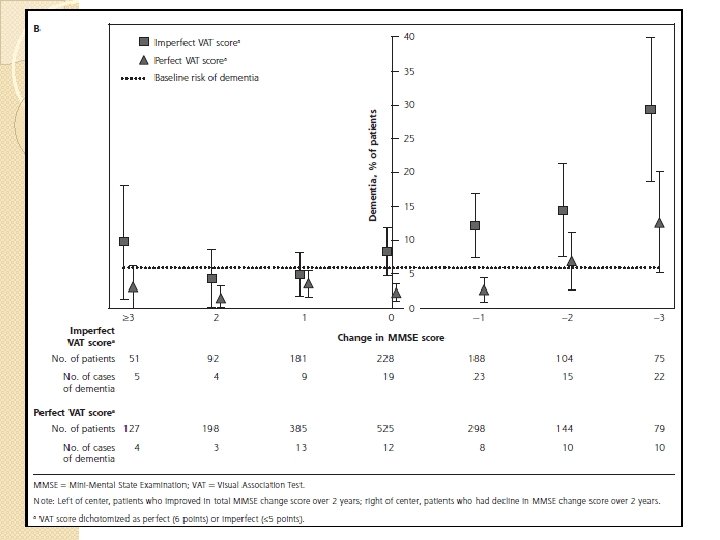 � Kötü VAT puanı, MMSE'deki 2 veya 3 puanlık düşüşün prediktif değerini sırasıyla % 10, 1'den % 14, 4'e ve % 20, 8'den % 29, 3'e yükseltti. � MMSE skorunda 1 puanlık düşüş gösteren hastalarda bile, kötü bir VAT skoru demans riskini % 12, 2'ye yani iki katına çıkardı. � Buna karşın, MMSE skorunda 2 veya 3 puanlık düşüş ve VAT skoru 6 olan hastalarda demans gelişme riski, bütün olarak ortalama riskten önemli ölçüde farklı değildi (Şekil 2 B).
