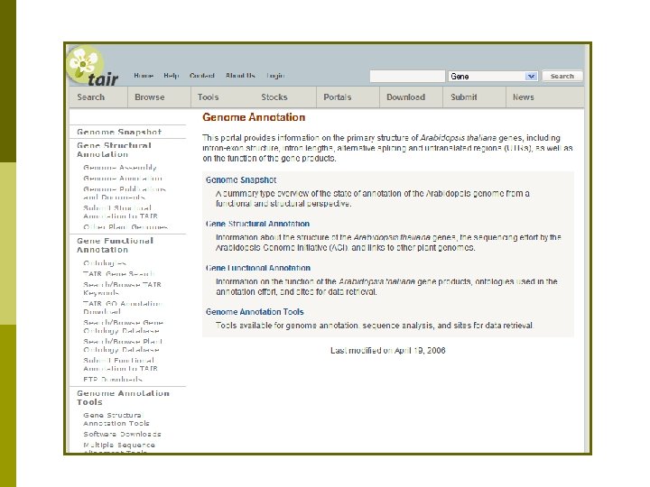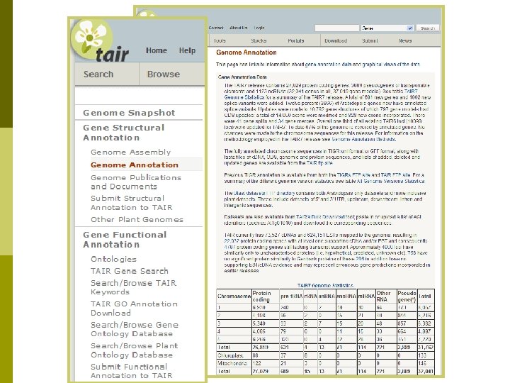 Where to find TAIR 7 data p TAIR: n n p Genome Annotation Portal Bulk Download Tool (Sequences) Seq. Viewer (genome browser) FTP site NCBI n genomes section