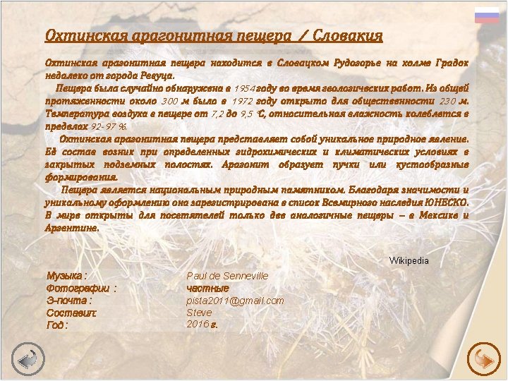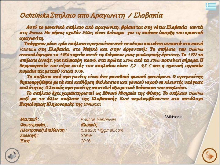 La caverna di aragonite Ochtiná / Slovacchia Questa unica cava di aragonite è situata nel sud della Slovacchia, vicino a Revuca. Anche se solo di 300 m di lunghezza, è famosa per la rara presenza di questo minerale. Ci sono solo tre grotte di aragonite al mondo aperte al pubblico (Ochtiná in Slovacchia, Messico e Argentina). La grotta di aragonite in Ochtiná è stata scoperta casualmente nel 1954 durante un rilevamento geologico. Delle 300 mt di lunghezza totale, solo 230 mt nel 1972 furono aperti ai visitatori. La temperatura dell'aria è 7, 2 – 9, 5 °C e l'midità relativa dell'aria è pari al 92 -97 %. La caverna di aragonite è un fenomeno naturale unico. Il minerale aragonite, si è formato dal continuo lavorio delle acque marine e d'acqua piovana nelle cavità sotterranee chiuse. La Aragonite bianca crea le rare decorazioni della caverna. La grotta è il monumento naturale nazionale. Insieme con altre grotte del Carso slovacco la grotta di Ochtiná, è inclusa nella lista del patrimonio mondiale dell'UNESCO. Música : Foto : E-mail : Selezione : Anno : Paul de Senneville private pista 2011@gmail. com Steve 2016 Wikipedia