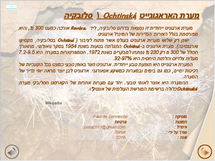 Az Ochtinai aragonit barlang / Szlovákia Ez az egyedülálló aragonit barlang a Szlovák Érchegységben található, nem messze Revúcától. A barlang hossza csaknem 300 méter, és közismert a ritka ásványi aragonit díszítésér ől. Csak három aragonit barlang van a világon, amely nyitva áll a nyilvánosság számára (Ochtinán kívül még egy-egy Mexikóban és Argentínában). A barlangot véletlenül fedezték fel 1954 -ben geológiai munkálatok során. A teljes hossza 300 méter, és ebből 1972 óta a látogatók számára 230 m megtekinthető. A barlang levegőjének hőmérséklete 7, 2 - 9, 5 °C és a relatív páratartalom 92 - 97 %. Az aragonit-barlang egyedülálló természeti jelenség. Az érdekes képződmények a tengeri és édesvízi környezetben, zárt földalatti üregekben kicsapódással formálódtak. Főleg fehér aragonit képezi a barlang ritka szép díszítését. Az Ochtinai aragonit barlang Szlovákiai természeti emlékei közé tartozik. A Szlovák-karszt többi barlangjával eggyüt a Ochtinai is szerepel az UNESCO Világörökségi listáján. Zene : Fotók : E-mail : Összeállította: Év : Paul de Senneville privát pista 2011@gmail. com Steve 2016 Wikipedia