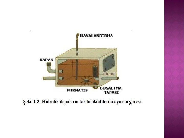 � Soğuk havalarda verimli çalışabilmesi için içerisinde ısıtıcı bulunmalıdır. � Emiş ve dönüş boruları birbirinden uzak, depo tabanından yukarıda ve yağın altında olmalıdır. Boru uçları açılı kesilmiş olmalıdır. � Depo tabanı, emiş boru tarafına doğru en az 5º eğimli olmalıdır. � Depo eğimli olduğu tarafta boşaltma tapası ve metal parçacıklarını tutacak mıknatıslı tapalar olmalıdır. � Sızıntı yapmayacak, dışarıdan yabancı madde ve su almayacak sağlamlıkta olmalıdır. � Yeterli büyüklükte temizleme kapağı olmalı ve temizlenebilmelidir