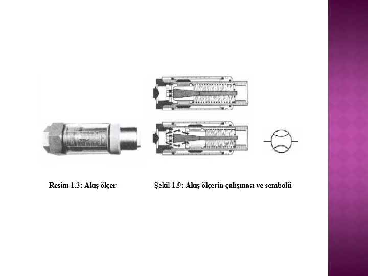 � Bir hidrolik devrede arıza ararken devrenin bir bölümünde veya tümünde debinin ölçülmesi için kullanılır. Şekilde akış ölçer üzerinde silindirik bir mıknatıs bulunan bir piston, konik bir pim, pistonun arka tarafında bulunan yay ve üzerinde debiyi okuduğumuz ölçeği bulunan bir göstergeden oluşur. � Akış ölçere giren akışkan, miktarına bağlı olarak pistonu iter. Piston üzerindeki mıknatıs da üst tarafta bulunan ibreyi hareket ettirerek debinin okunmasını sağlar(Şekil 1. 9).