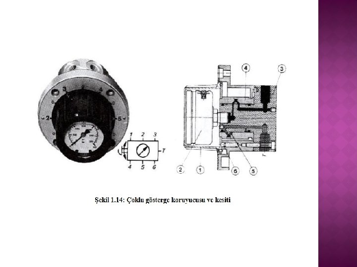 � Basınçölçer koruma valfi aslında 3 yollu düğme, uyarılı bir sürgülü valftır. Basınçölçerin sürekli basınç altında kalmamasını, basıncın istendiği zaman okunmasını sağlar. Valfin iki konumu vardır. Sıfır konumunda yay (1)ile itme sürgüsü (2) basınç deliğini kapar, basınçölçeri depoya bağlar. Çalışma konumunda ise basınçlı yağ basınçölçere giderken depo ile bağlantı kesilir. Basınçölçer doğrudan gövdeye veya dışarıda bir yere bağlanabilir