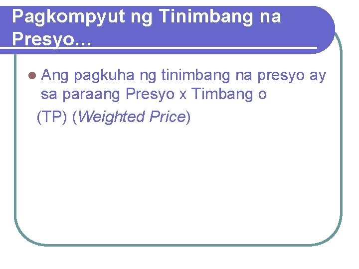 Pagkompyut ng Tinimbang na Presyo… l Ang pagkuha ng tinimbang na presyo ay sa paraang Presyo x Timbang o (TP) (Weighted Price)