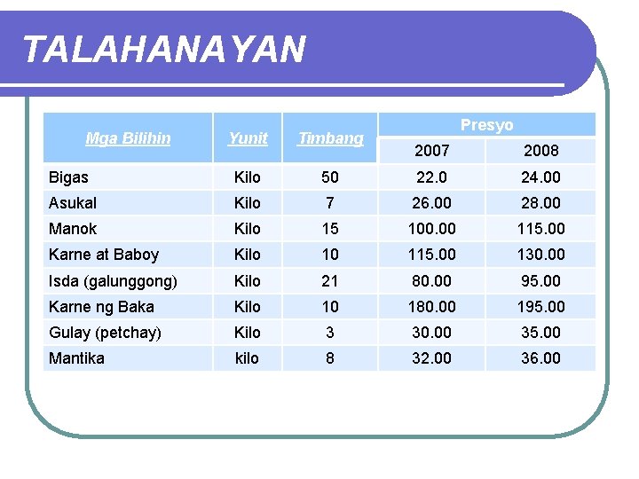 TALAHANAYAN Mga Bilihin Yunit Timbang Bigas Kilo Asukal Presyo 2007 2008 50 22. 0 24. 00 Kilo 7 26. 00 28. 00 Manok Kilo 15 100. 00 115. 00 Karne at Baboy Kilo 10 115. 00 130. 00 Isda (galunggong) Kilo 21 80. 00 95. 00 Karne ng Baka Kilo 10 180. 00 195. 00 Gulay (petchay) Kilo 3 30. 00 35. 00 Mantika kilo 8 32. 00 36. 00