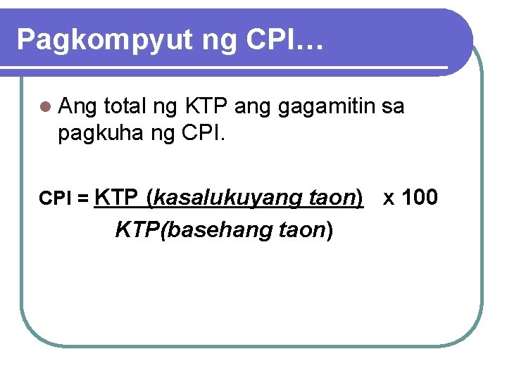 Pagkompyut ng CPI… l Ang total ng KTP ang gagamitin sa pagkuha ng CPI = KTP (kasalukuyang taon) x 100 KTP(basehang taon)