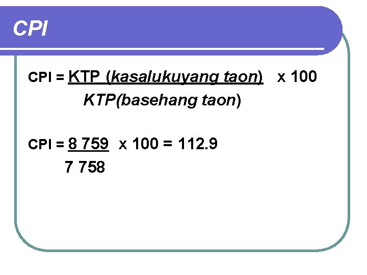 CPI = KTP (kasalukuyang taon) x 100 KTP(basehang taon) CPI = 8 759 x 100 = 112. 9 7 758