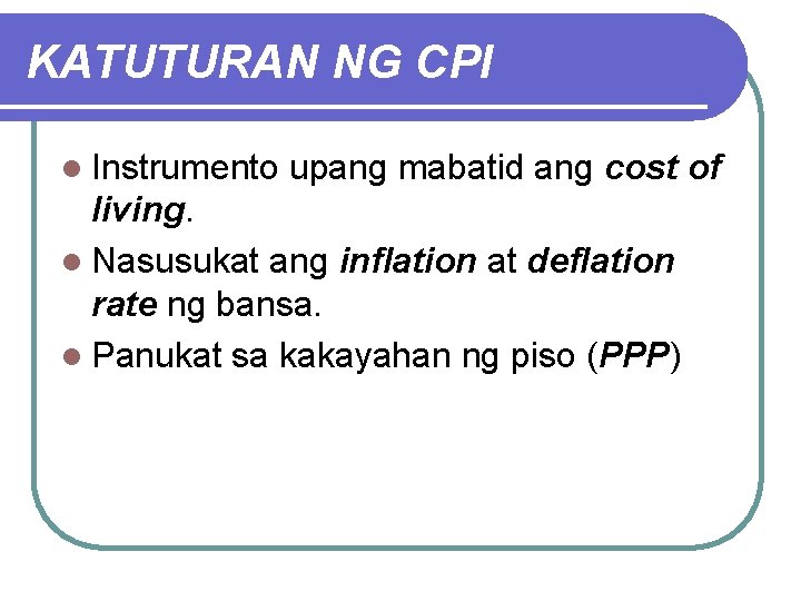 KATUTURAN NG CPI l Instrumento upang mabatid ang cost of living. l Nasusukat ang inflation at deflation rate ng bansa. l Panukat sa kakayahan ng piso (PPP)