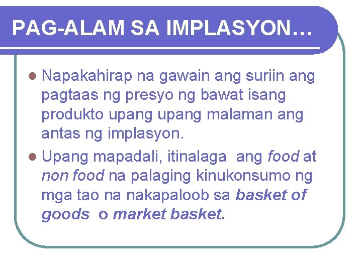 PAG-ALAM SA IMPLASYON… l Napakahirap na gawain ang suriin ang pagtaas ng presyo ng bawat isang produkto upang malaman ang antas ng implasyon. l Upang mapadali, itinalaga ang food at non food na palaging kinukonsumo ng mga tao na nakapaloob sa basket of goods o market basket.