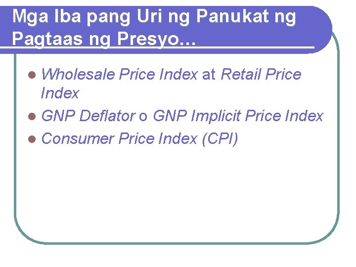 Mga Iba pang Uri ng Panukat ng Pagtaas ng Presyo… l Wholesale Price Index at Retail Price Index l GNP Deflator o GNP Implicit Price Index l Consumer Price Index (CPI)