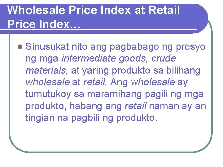 Wholesale Price Index at Retail Price Index… l Sinusukat nito ang pagbabago ng presyo ng mga intermediate goods, crude materials, at yaring produkto sa bilihang wholesale at retail. Ang wholesale ay tumutukoy sa maramihang pagili ng mga produkto, habang retail naman ay an tingian na pagbili ng produkto.