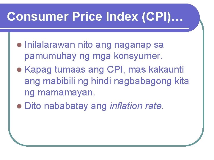 Consumer Price Index (CPI)… l Inilalarawan nito ang naganap sa pamumuhay ng mga konsyumer. l Kapag tumaas ang CPI, mas kakaunti ang mabibili ng hindi nagbabagong kita ng mamamayan. l Dito nababatay ang inflation rate.