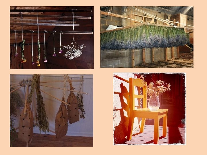 Spôsob sušenia rastlín Vzduch musí cirkulovať rovnomerne okolo všetkých kvetov, preto by sme mali jednotlivé kytice umiestňovať v dostatočnej vzdialenosti od seba, aby všetky kvetiny rovnomerne uschli. Dbáme na to, aby sa listy pri sušení vzájomne nedotýkali, lebo by skôr zhnili, ako sa usušili.