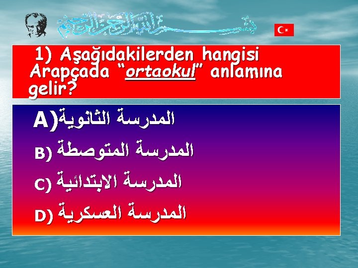 3) ” ”ﻫﺎﺫﺍ ﺗﻠﻤﻴﺬ cümlesinin Türkçe anlamı hangisidir? A) Bu bir öğrencidir. B) Bu bir öğretmendir. C) Bu bir kızdır. D) Bu bir çocuktur.