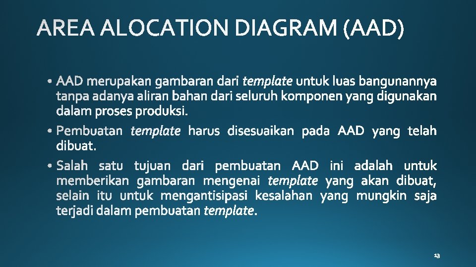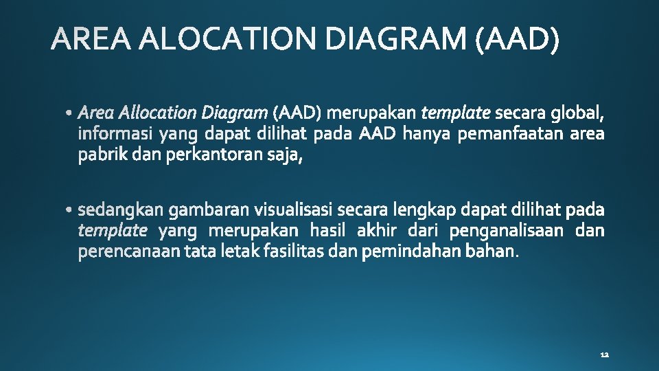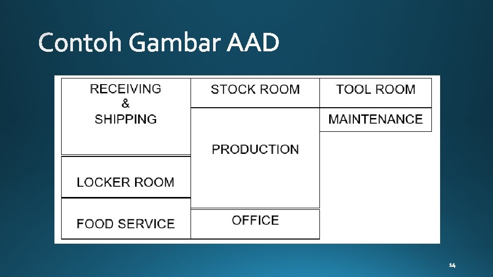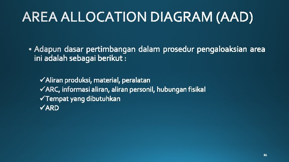 lanjutan dari ARC • Area Allocation Diagram (AAD) adalah suatu gambaran dari tata letak produksi yang sebenarnya dan memuat alokasi dari mesin dan produksi, beserta storage, range cost, receiving, shipping, dan lain-lain.