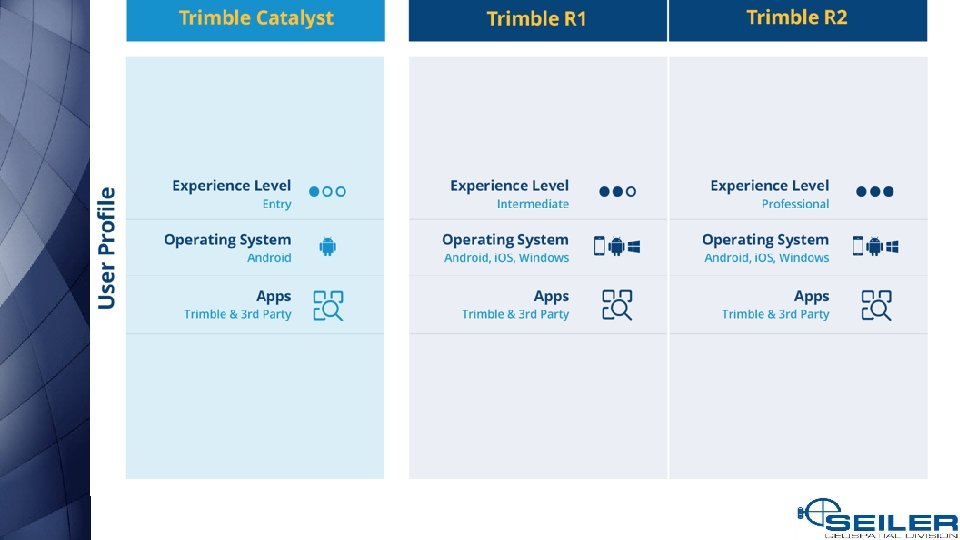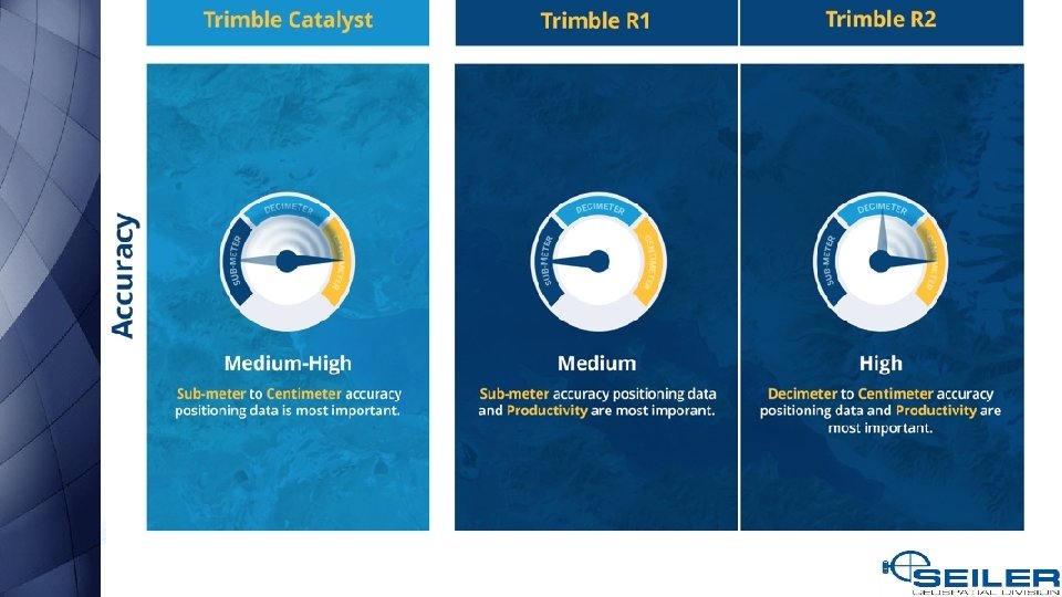 What are my options? • • • Bad Elf GNSS Surveyor, GPS Pro, and GPS Pro+ Dual XGPS 150 A and XGPS 160 Eos Arrow Lite, Arrow 100, Arrow 200, and Arrow Gold Garmin GLO¹ Geneq Sx. Blue II and Sx. Blue III² Juniper Geode Leica GG 03¹, GG 04, and Zeno 20¹ Septentrio Altus NR 2 and Altus Geo. Pod² Spectra Precision SP 60¹ and Mobile. Mapper 300¹ Trimble Catalyst Trimble R 1, R 2, R 8 s¹, and R 10¹