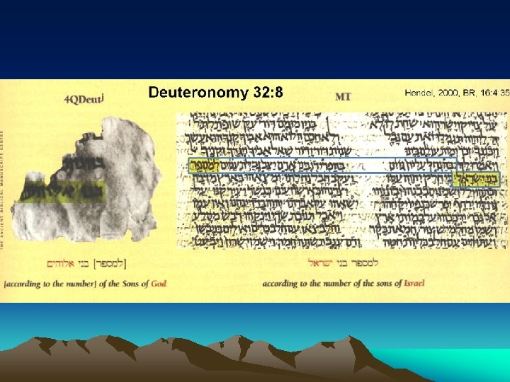 CHANGES MADE IN TEXT BY SCRIBES: Deuteronomy 32: 8 • The Dead Sea Scroll fragment 4 QDeut-j has polytheistic overtones: “. . . [according to the number] of the sons of God. ” • The Masoritic text (MT) relates a more palatable, “according to the number of the sons of Israel”