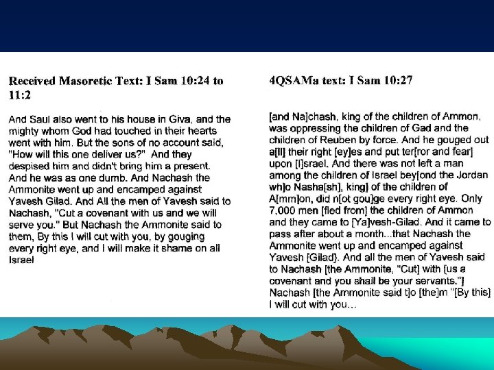 RECOVERED PORTION OF BOOK OF SAMUEL • MT suggests that Nachash had terms of surrender that violated international law of that time (as we know it). • DSS 4 QSam-a indicates that Nachash did NOT pounce on Yavesh-Gilad for nothing • The inhabitants were assisting the rebels and deserved to have their eyes put out