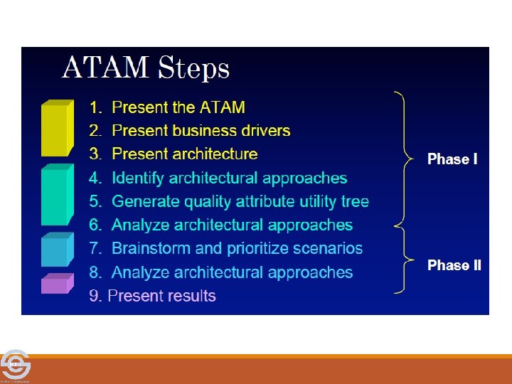 ATAM Phases Phase Activity Participants Typical duration 0 Partnership and preparation: Evaluation team Logistics, planning, stakeholder leadership and key recruitment, team formation project decisionmakers Proceeds informally as required, perhaps over a few weeks 1 Evaluation: Steps 1 -6 Evaluation team and project decisionmakers 1 -2 days followed by a hiatus of 2 -3 weeks 2 Evaluation: Steps 7 -9 Evaluation team, project decision makers, stakeholders 2 days 3 Follow-up: Report generation Evaluation team and delivery, process evaluation client improvement 1 week