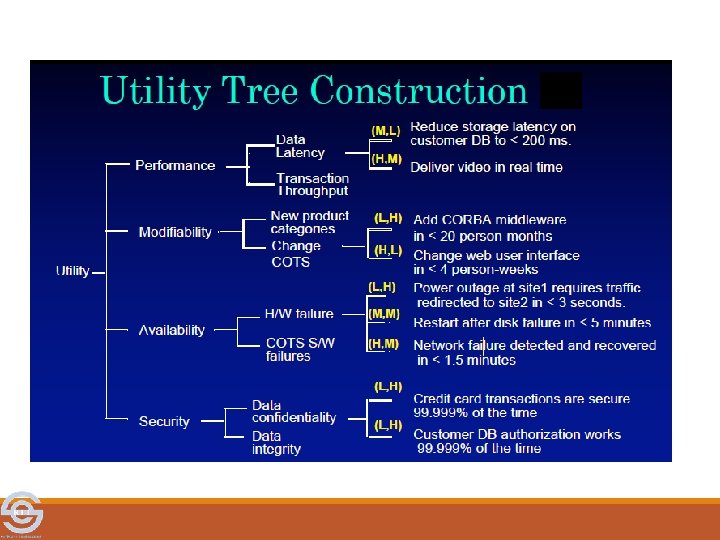 ATAM Steps (cont) 4. Identify places in the architecture that are key to addressing architectural drivers ◦ Identify predominant styles and tactics chosen 5. Generate QA utility tree – tool for evaluation ◦ Most important QA goals are high level nodes (typically performance, modifiability, security, and availability) ◦ Scenarios are the leaves ◦ Output: a characterization and prioritization of specific quality attribute requirements. ◦ High/Medium/Low importance for the success of the system ◦ High/Medium/Low difficulty to achieve (architect’s assessment)