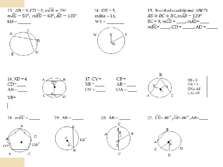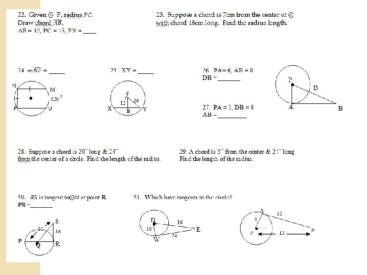 Find x. 1. 2. Suppose a chord of a circle is 10 inches long and is 12 inches from the center of the circle. Find the length of the diameter. 3. Suppose the diameter of a circle is 34 inches long and a chord is 30 inches long. Find the distance between the chord and the center of the circle. 4. Suppose a chord of a circle is 24 cm long and is 15 cm from the center of the circle. Find the length of the radius.