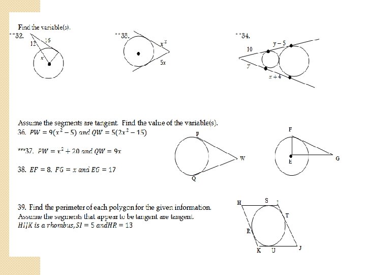 Tangent Line- a line that intersects a �in one point (pt of tangency) Thm: If a line is tangent to a � , then it is perpendicular to its radius. …. . is the converse true? ? Thm: If two segments form the same exterior pt are tangent, then they are then they .