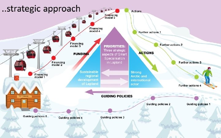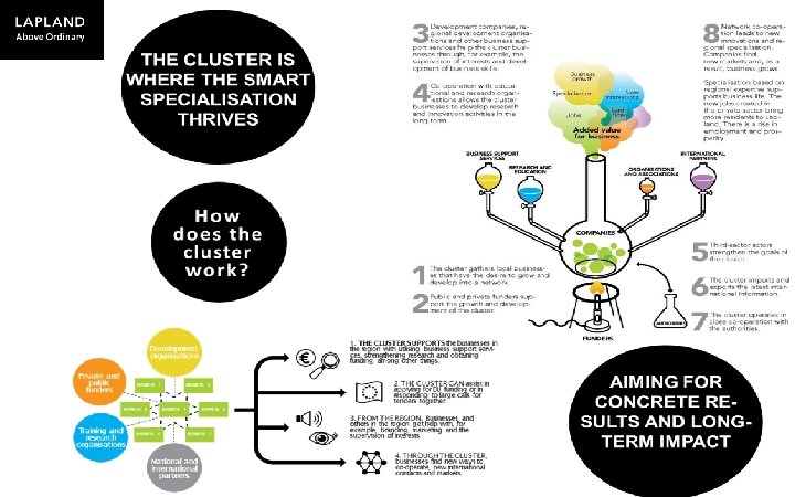 Next steps ”The Future looks smart and excellence” VISION 2030 DEVELOPMENT GOAL OVERALL OBJECTIVE RESULTS ACTIONS The most innovative sparsely populated region in the EU Clusters (5) and their actors operating at EU arena ASE supports and enables cluster development and internationalisation Cluster develoment is maturated and consolidad Lapland R&D&I Centre of Excellence established Clusters operating at international arena (EU) Execution of Lapland S 3 strategy by supporting Cluster based actions, Strong Regional basis for R&D&I, Brand management and profiling Lapland as an innovative region and partner for collaboration Arctic Smartness