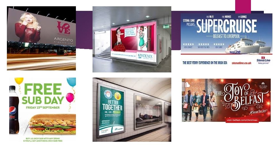 Our products. Christmas advertisement for Argento Valentines campaigns and industry gala balls for Phoenix Gas Super. Cruise campaigns, Christmas campaigns, Snow Factor where they gathered winter pictures and took over Stena Line’s Instagram page Subway - Customer Appreciation Free Sub day campaigns, 5 K Helping Hearts race, Subway breakfasts Translink – Commuter campaigns which encouraged customers to leave their car at home, campaigns on Vimeo Visit Belfast – Christmas campaigns, ‘Backin’ Belfast’ campaign
