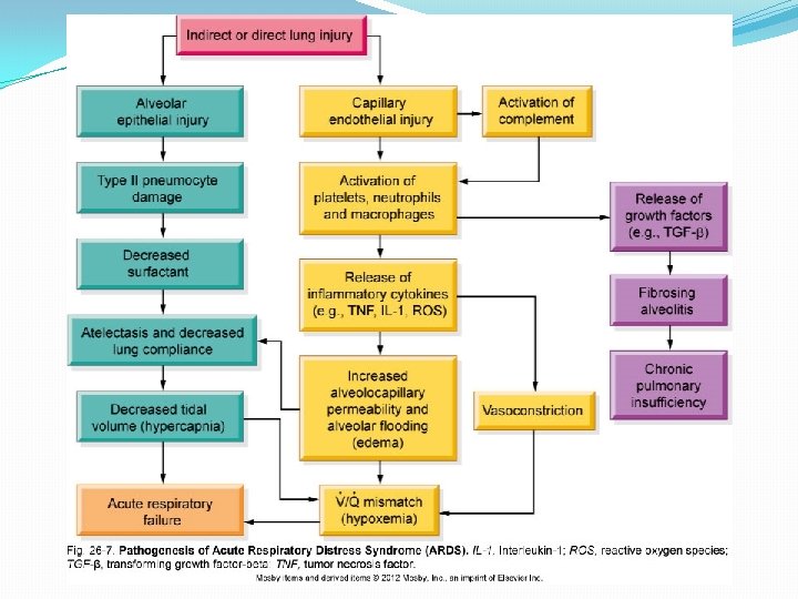 �ARDS �Inflammatory response injures alveolocapillary membrane disrupted gas exchange V/Q mismatch hypoxemia �Inflammatory response injures alveolocapillary membrane increased capillary permeability pulmonary edema