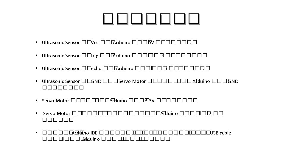 Arduino Uno Servo Motor Ultrasonic sensor Jumper Wires Slides: 9 Download presentation स ह तय Arduino Uno Servo Motor Ultrasonic sensor स ह त य Jumper Wires Glue Gun With Glue Sticks Cardsheet Paper ������ 5 V 6 GND 5 echo 7 trig 3. 3 V VCC Servo Motor Ultrasonic Sensor GND Arduino Uno ������� Arduino Ultrasonic Sensors 5 V Pin Vcc pin Pin 5 trig Pin 6 echo GND Arduino Servo Motor 3. 3 V Pin Red Wire GND Black Wire Pin 7 Yellow Wire Costing �. �. ������� �� ( �� ���� ( 1 Arduino UNO 500 1 500 2 Servo Motor (180 degree) 180 1 180 3 Ultrasonic Sensor 170 1 170 4 wires 5 7 35 Total 885