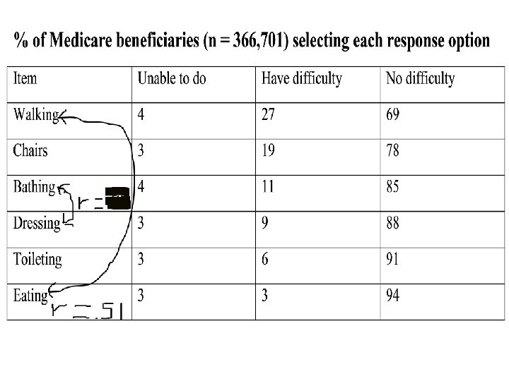 Confirmatory Factor Analysis (Polychoric* Correlations) Dressing Eating Bathing *Estimated correlation between two underlying normally distributed continuous variables Walking Chairs Toileting Residual correlations <= 0. 04