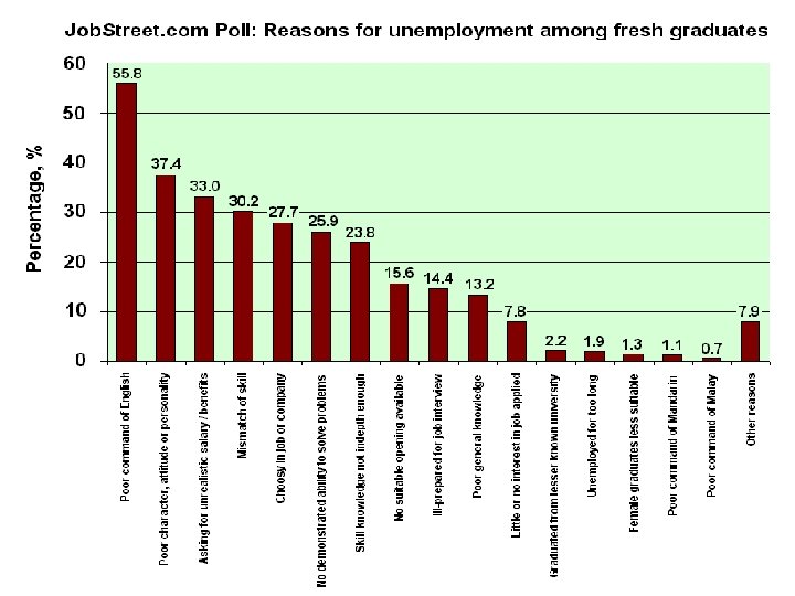 Reasons why companies don’t hire fresh graduates Only 15% of the managers indicated that there are no suitable job openings for fresh graduates. Top 3 reasons: 1. Poor command of English (55%) 2. Poor character, attitude or personality (37%) 3. Asking for unrealistic salaries and benefits (33%)