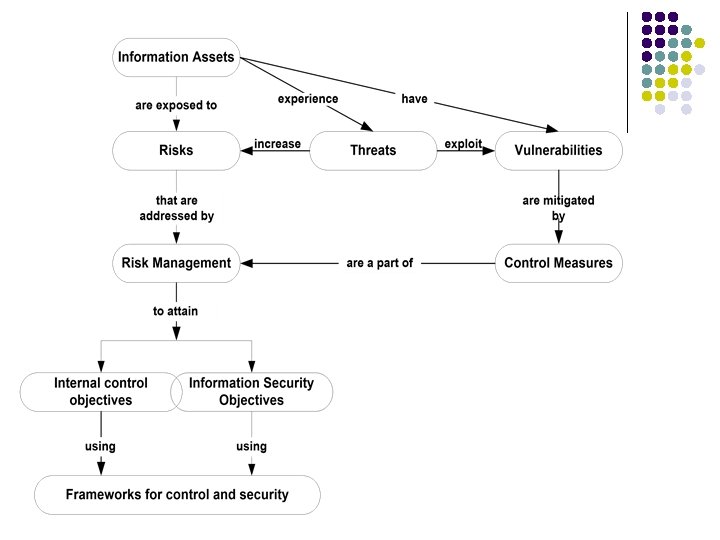 Risk l l Risk: Risk represents the possibility of a loss or harm to an entity. l An entity can be a person, an organization, a resource, a system, or a group. l In our case, the entity can be broadly characterized as a target system (information assets). Risk exposures: A risk exposure represents all kinds of possibilities of harm to an entity without regard to its likelihood. l Not all exposures equally impact every entity. l Therefore, risk is assessed in terms of those exposures that have a high probability of affecting the target system. Risks (and exposures) can be emerging from within (internal sources) or from outside the boundary of the organization (external). Risks keep changing. Existing risks may gain strength or weaken, and new risks emerge.