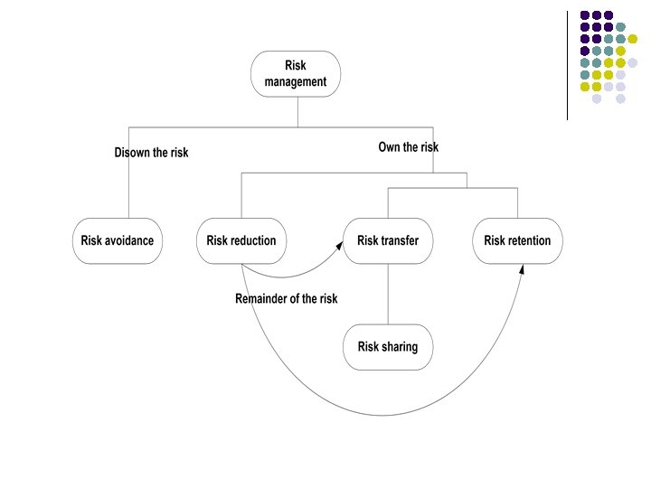Risk Management l l l Risk management: A systematic approach to manage risk to a target system. Risk appetite: An organization’s ability to accept risk. Approaches to risk management l Don’t own (disown) the risk l l Risk avoidance: A deliberate attempt to keep the target system away from a specific risk. Example: Avoid travel by air. Own the risk l l Risk reduction: Proactive measures to prevent a loss from occurring, or to limit losses. Example: Firewall installation to screen traffic. Risk transfer: Transfer target system risk to some other entity. Example: outsourcing, subcontracting. § l Risk sharing: Entities facing identical exposure join together and pool their resources. Example: Neighborhood watch groups, insurance. Risk retention: Management’s desire to accept risk. Example: Leadership tram traveling on the same flight.