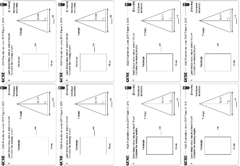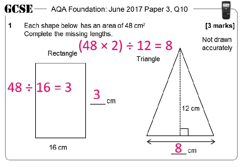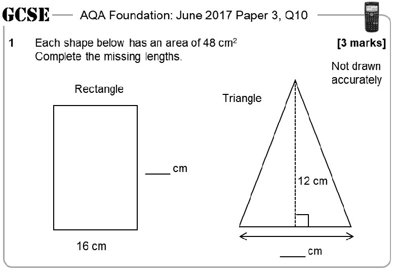AQA Foundation: June 2017 Paper 3, Q 10 1 Each shape below has an area of 48 cm 2 Complete the missing lengths. Rectangle AQA Foundation: June 2017 Paper 3, Q 10 [3 marks] 1 Not drawn accurately Each shape below has an area of 48 cm 2 Complete the missing lengths. Rectangle Triangle ____ cm 16 cm 12 cm 16 cm ____ cm AQA Foundation: June 2017 Paper 3, Q 10 Not drawn accurately Triangle 1 [3 marks] Each shape below has an area of 48 cm 2 Complete the missing lengths. Rectangle ____ cm Not drawn accurately Triangle ____ cm 12 cm 16 cm ____ cm AQA Foundation: June 2017 Paper 3, Q 10 [3 marks] Each shape below has an area of 48 cm 2 Complete the missing lengths. Rectangle Not drawn accurately Triangle 12 cm 1 [3 marks] ____ cm 12 cm 16 cm ____ cm
