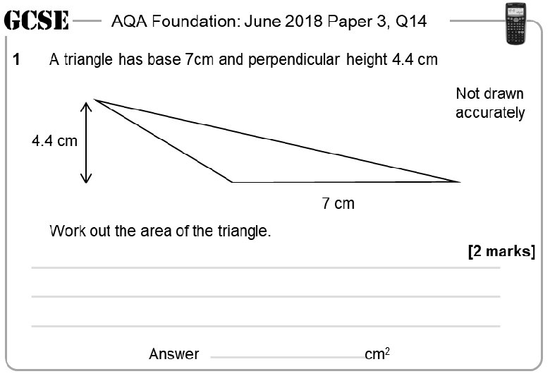 AQA Foundation: June 2018 Paper 3, Q 14 1 AQA Foundation: June 2018 Paper 3, Q 14 A triangle has base 7 cm and perpendicular height 4. 4 cm 1 A triangle has base 7 cm and perpendicular height 4. 4 cm Not drawn accurately 4. 4 cm 7 cm Work out the area of the triangle. [2 marks] Answer [2 marks] cm 2 Answer AQA Foundation: June 2018 Paper 3, Q 14 1 cm 2 AQA Foundation: June 2018 Paper 3, Q 14 A triangle has base 7 cm and perpendicular height 4. 4 cm 1 A triangle has base 7 cm and perpendicular height 4. 4 cm Not drawn accurately 4. 4 cm 7 cm Work out the area of the triangle. [2 marks] Answer cm 2