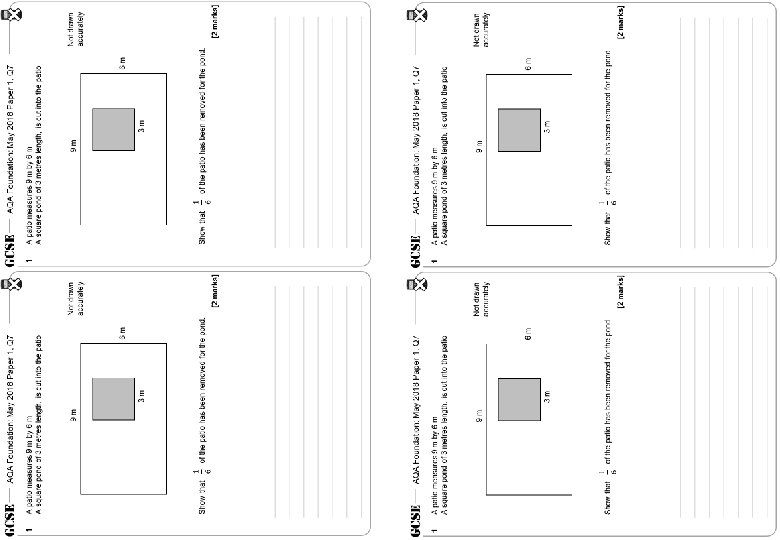 AQA Foundation: May 2018 Paper 1, Q 7 1 AQA Foundation: May 2018 Paper 1, Q 7 A patio measures 9 m by 6 m A square pond of 3 metres length, is cut into the patio 1 Not drawn accurately 9 m A patio measures 9 m by 6 m A square pond of 3 metres length, is cut into the patio Not drawn accurately 9 m 6 m 6 m 3 m 3 m [2 marks]