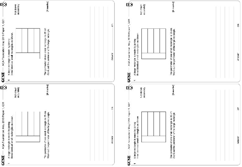 AQA Foundation: May 2018 Paper 1, Q 31 1 A large rectangle is made by joining three identical small rectangles as shown. Not drawn accurately The perimeter of one small rectangle is 35 cm Work out the perimeter of the large rectangle. Answer [4 marks] cm