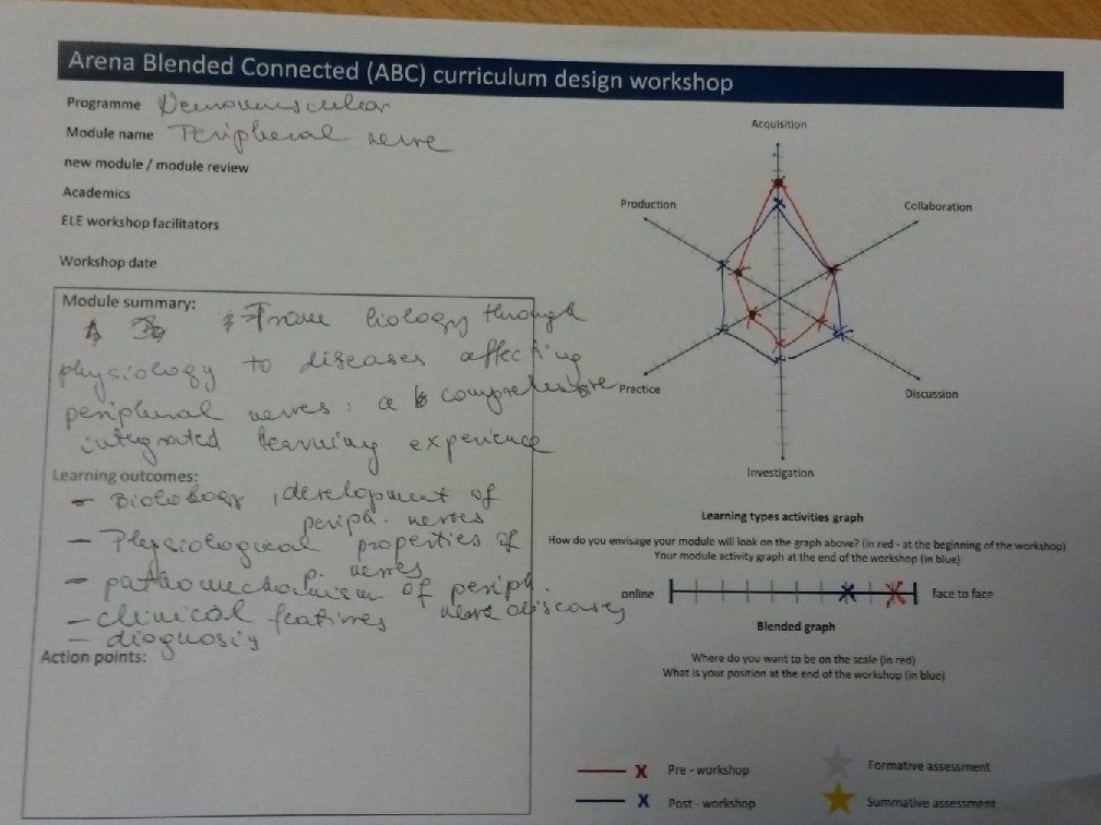 ABC curriculum design Workshop schedule: 1. Module info and graphs sheet • Tweet your module – tweet size description of your module • Module shape (Learning types activities graph) distribution of learning types • Blend – (blended graph) 2. Storyboard sheet • Storyboard – learning types sequences and activities • Assessment – align activities and assessment 3. Module info and graphs sheet • Review the graphs – what has changed? Why? 4. Actions – what next for team?