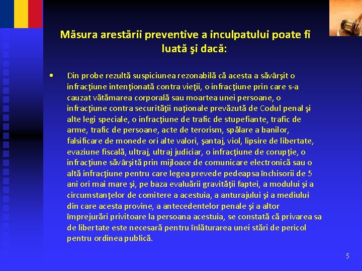 Măsura arestării preventive a inculpatului poate fi luată şi dacă: • Din probe rezultă suspiciunea rezonabilă că acesta a săvârşit o infracţiune intenţionată contra vieţii, o infracţiune prin care s-a cauzat vătămarea corporală sau moartea unei persoane, o infracţiune contra securităţii naţionale prevăzută de Codul penal şi alte legi speciale, o infracţiune de trafic de stupefiante, trafic de arme, trafic de persoane, acte de terorism, spălare a banilor, falsificare de monede ori alte valori, şantaj, viol, lipsire de libertate, evaziune fiscală, ultraj judiciar, o infracţiune de corupţie, o infracţiune săvârşită prin mijloace de comunicare electronică sau o altă infracţiune pentru care legea prevede pedeapsa închisorii de 5 ani ori mare şi, pe baza evaluării gravităţii faptei, a modului şi a circumstanţelor de comitere a acestuia, a anturajului şi a mediului din care acesta provine, a antecedentelor penale şi a altor împrejurări privitoare la persoana acestuia, se constată că privarea sa de libertate este necesară pentru înlăturarea unei stări de pericol pentru ordinea publică. 5