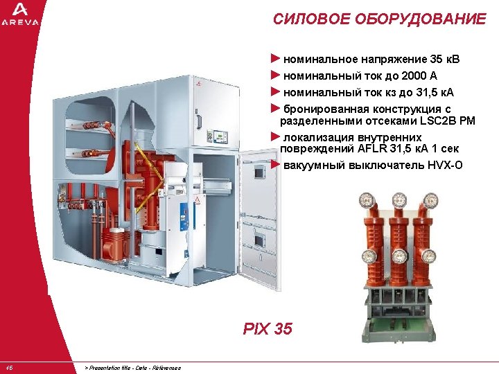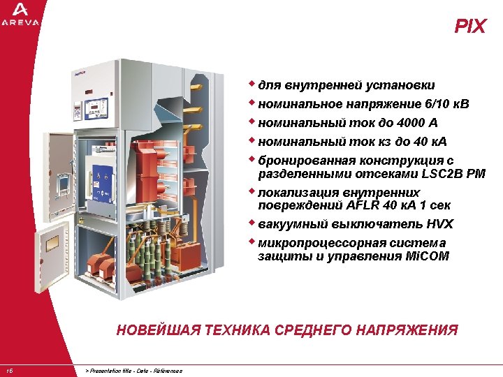 PIX u PIX-H AIS LSC 2 B PM AFLR 50 KA 1 SEC 6 -10 KV, 4000 А, 50 KА u PI AIS LSC 2 A PI AFLR 25 KA 1 SEC 6 -10 -20 KV, 1250 А, 25 KА u PIX 35 AIS LSC 2 B PM AFLR 31. 5 KA 1 SEC 35 KV, 2500 А, 31. 5 KА u PIX-MCC AIS LSC 2 B PM AFLR 40 KA 1 SEC 6 k. V, 400 А, 40 KА 14 > Presentation title - Date - Références u PIX AIS LSC 2 B PM AFLR 40 KA 1 SEC 6 -10 -20 KV, 4000 А, 40 KА