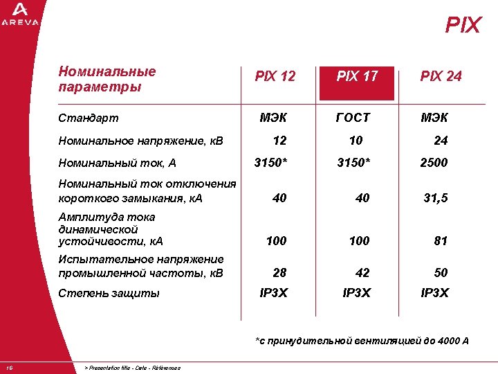 PIX Габаритные размеры PIX 12 PIX 17 Высота, мм 2130 2200 Глубина, мм 1400 1500 PIX 24 2330 1600 Ширина, мм 17 630 А 650 750 800 1250 А 650 750 800 1600 А 800 750 800 2000 А 800 750 1000 2500 А 1000 3150 А 1000 > Presentation title - Date - Références