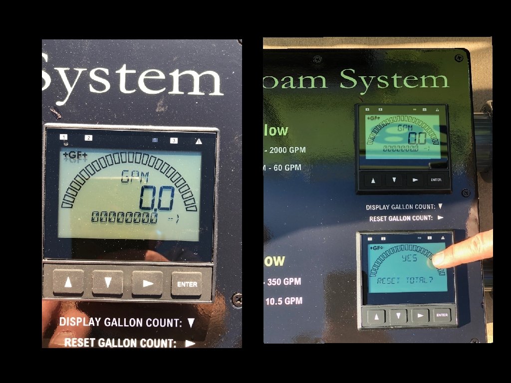 Roof/Mechanic Procedure • Close one of the orange valves (only one should be open during testing). The large valve is turrets on both high and low flow. The small valve is for the under trucks and the hand line. • Open lid of rig tank. Fill tank to middle of the chimney but DO NOT OVERFLOW. Overflow will result in miscalculations. (signal to the hydrant meter member when to stop filling) • Mechanic will record the number on the meter as the total gallon starting number on the test sheet • Reset gallon counter on the tester’s readout panel by pushing right arrow once. The panel will show “RESET TOTAL” with default “NO”. Push down arrow once to select “YES” then push enter • At this point cab member will initiate test for 60 seconds